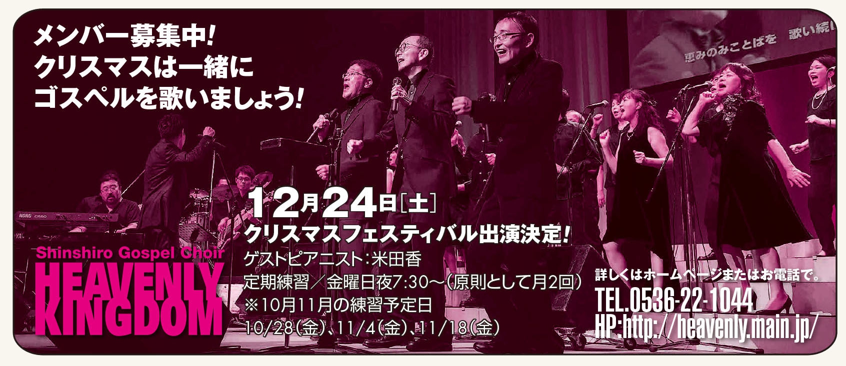 クリスマスには人々をいやす力があります。新城教会では、毎年、クリスマスをお祝いし、「ゴスペル・コンサート」を開催しています。今年は、アメリカのブラック・ゴスペル界で大活躍しているジョン・フルッカーとニッコー・ロウが生バンドの演奏をバックに、ダイナミックな歌声を響かせます。